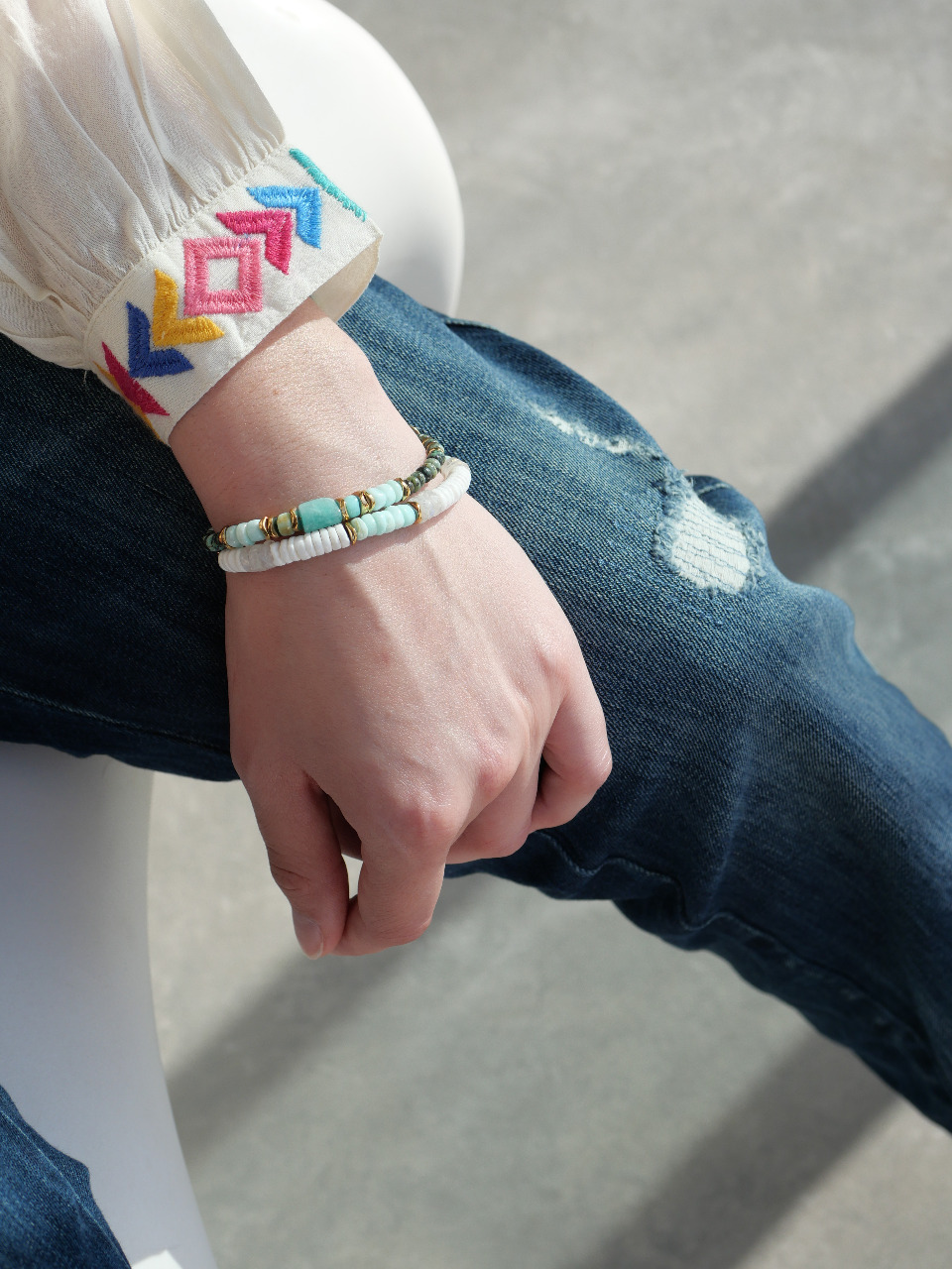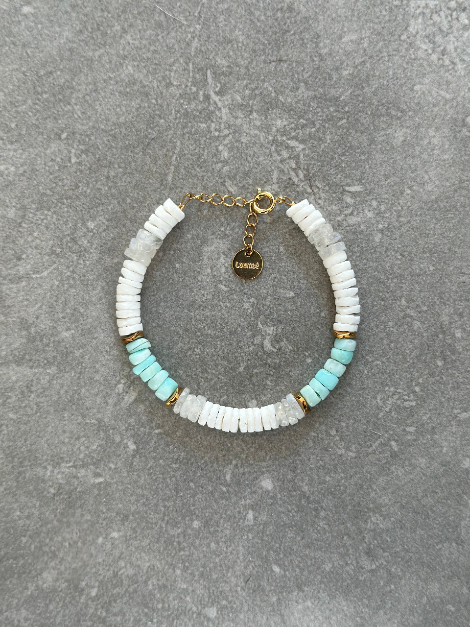 Bracelet en coquillage, opale bleue, pierre de lune et hématite dorée.