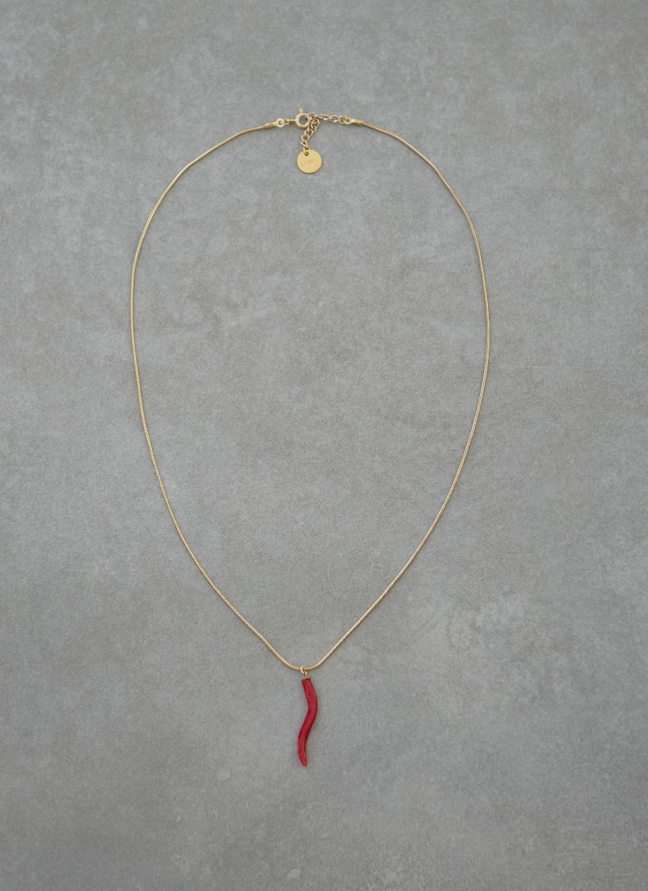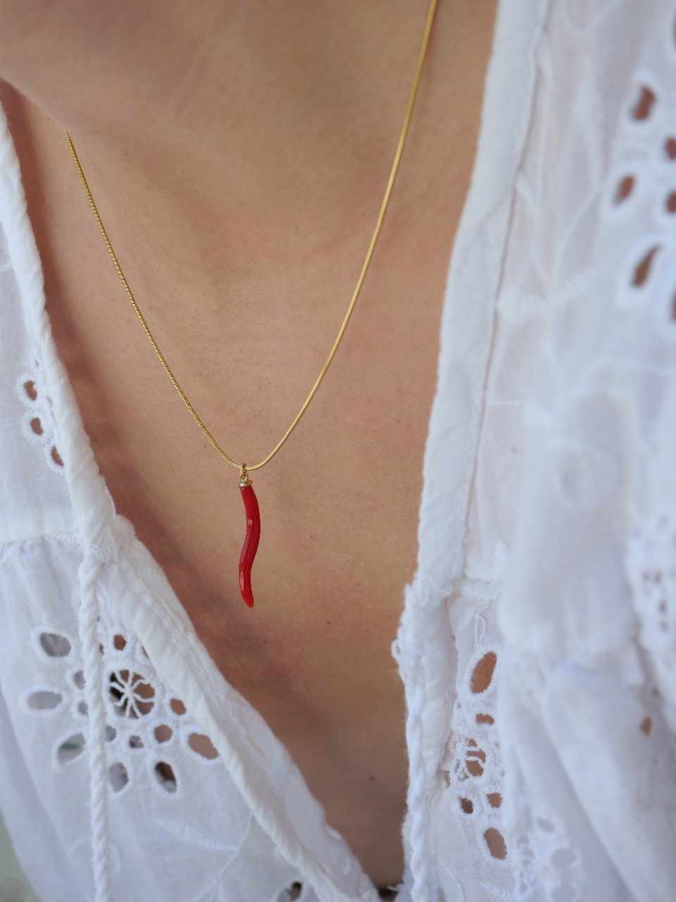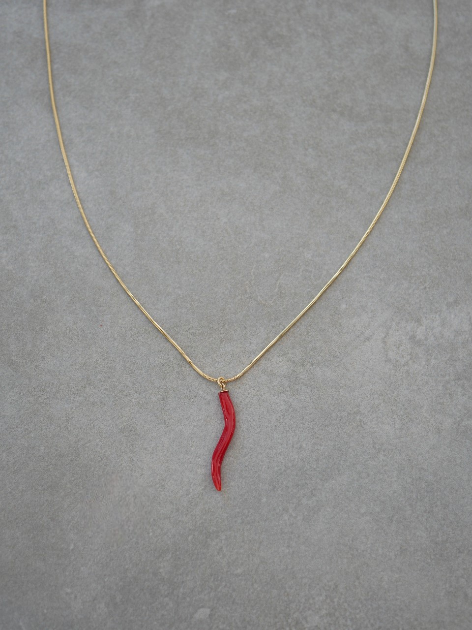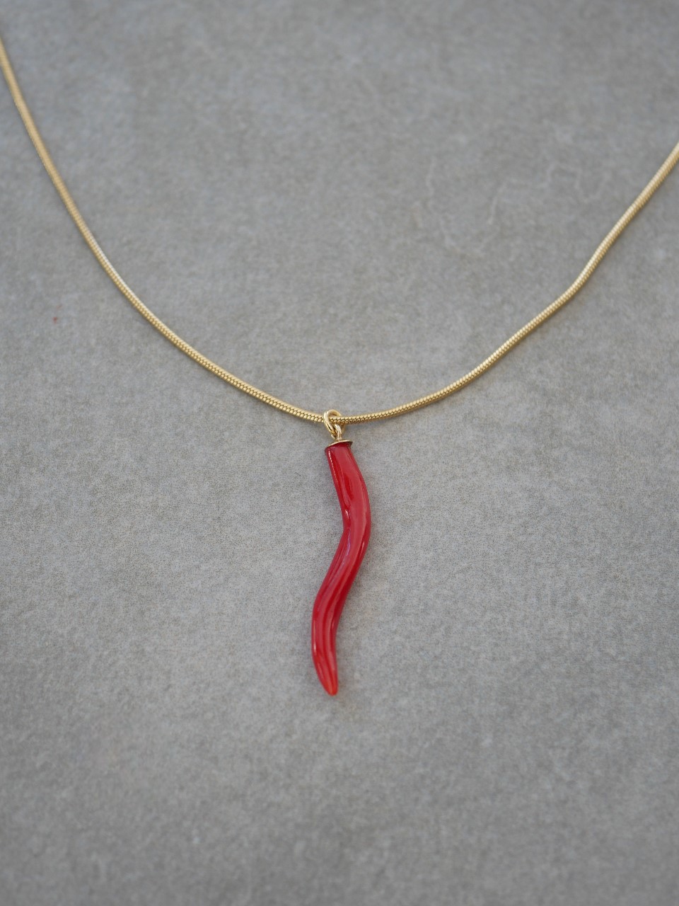 Collier composé d’une chaine fine maille serpent plaquée or 3 microns, et d’un pendentif composé d’une corne en corail véritable