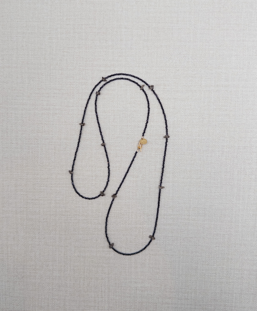 Le sautoir Taha spinel, est un sautoir fin composé de petites perles en spinel et en quartz fumé. A porter en sautoir, en collier double rang, ou autour du poignet et à accumuler sans modération !