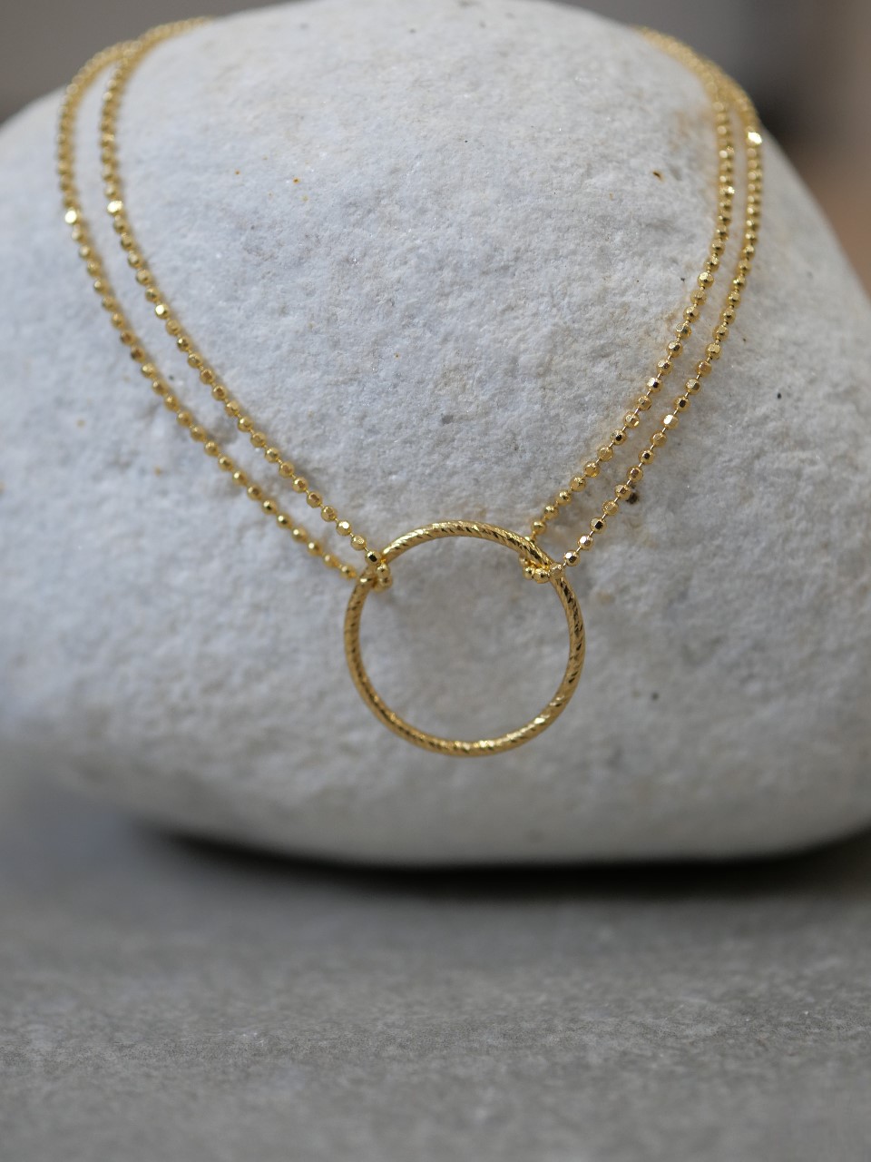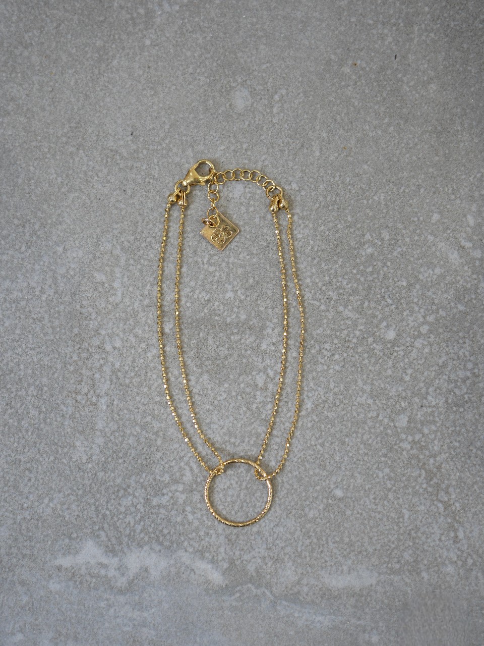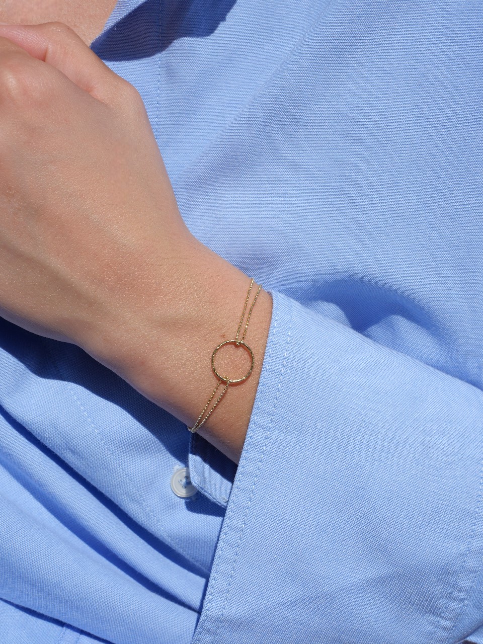 Bracelet composé d’une chaine fine scintillante, maille boule, plaquée or 3 microns et d’un pendentif rond en Gold Filled.