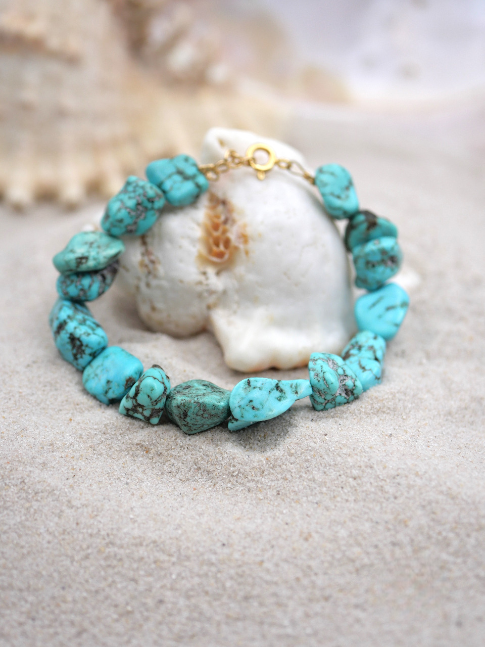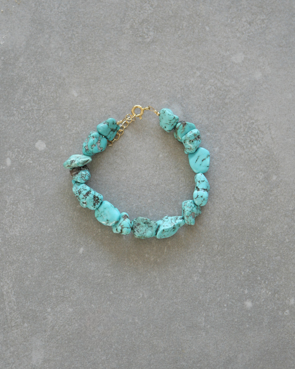Bracelet entièrement composé de pépites en turquoises naturelles irrégulières.
