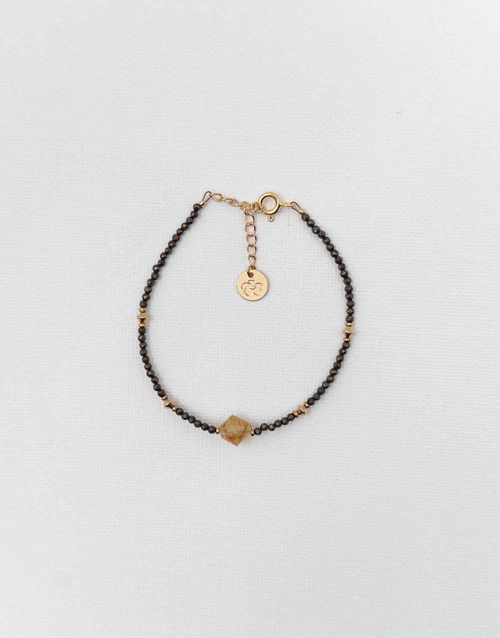 Bracelet fin composé de pyrite, de citrine et de perles plaquées or. Exclusivité site.