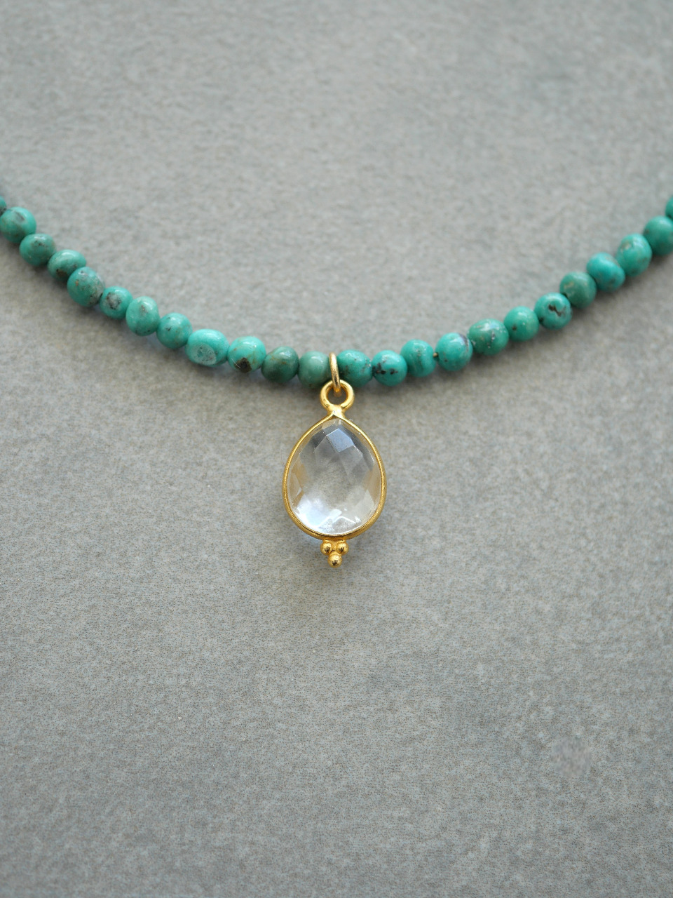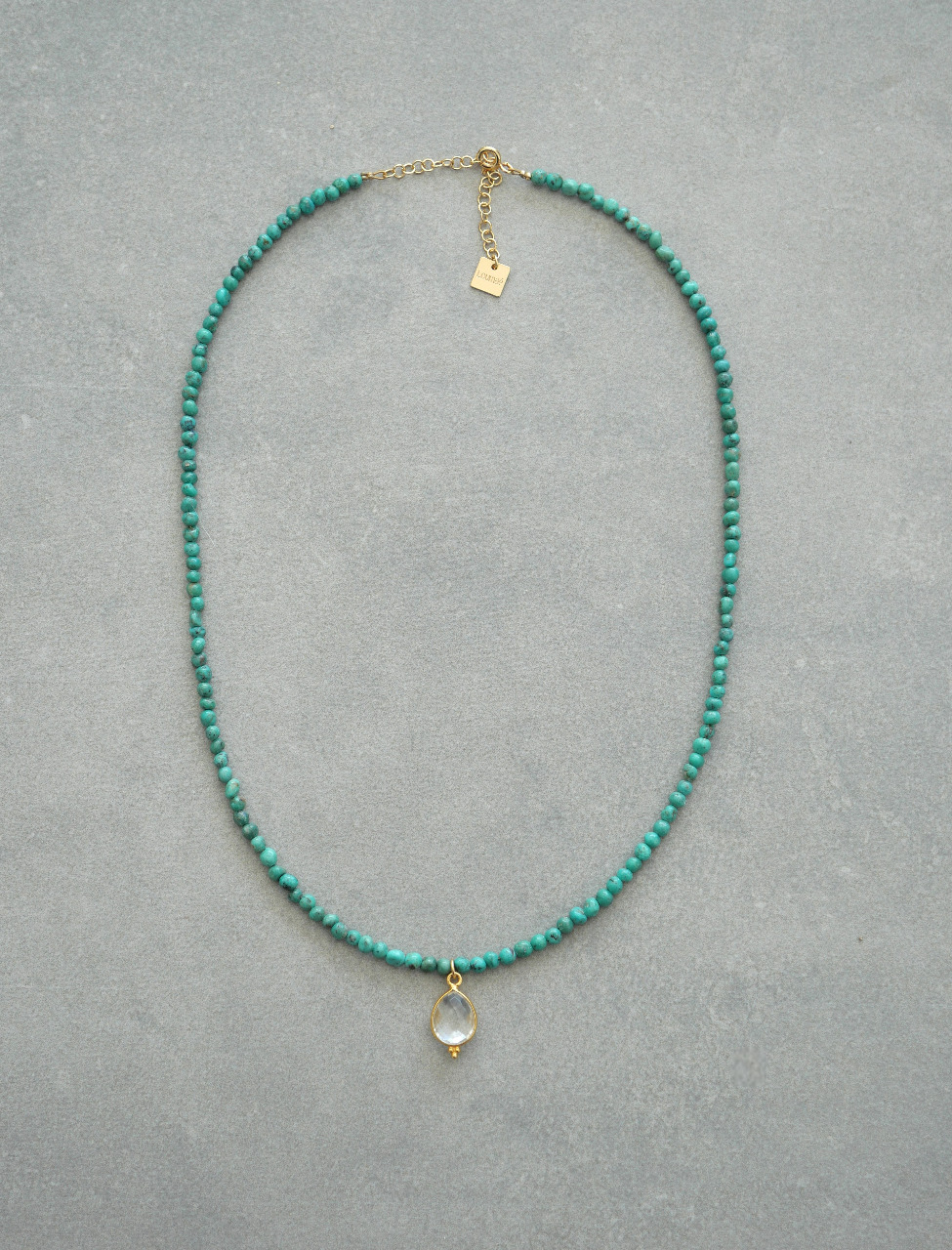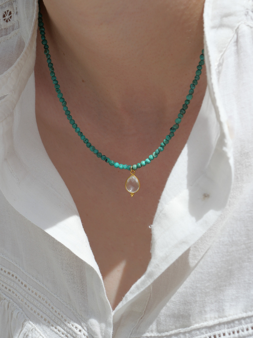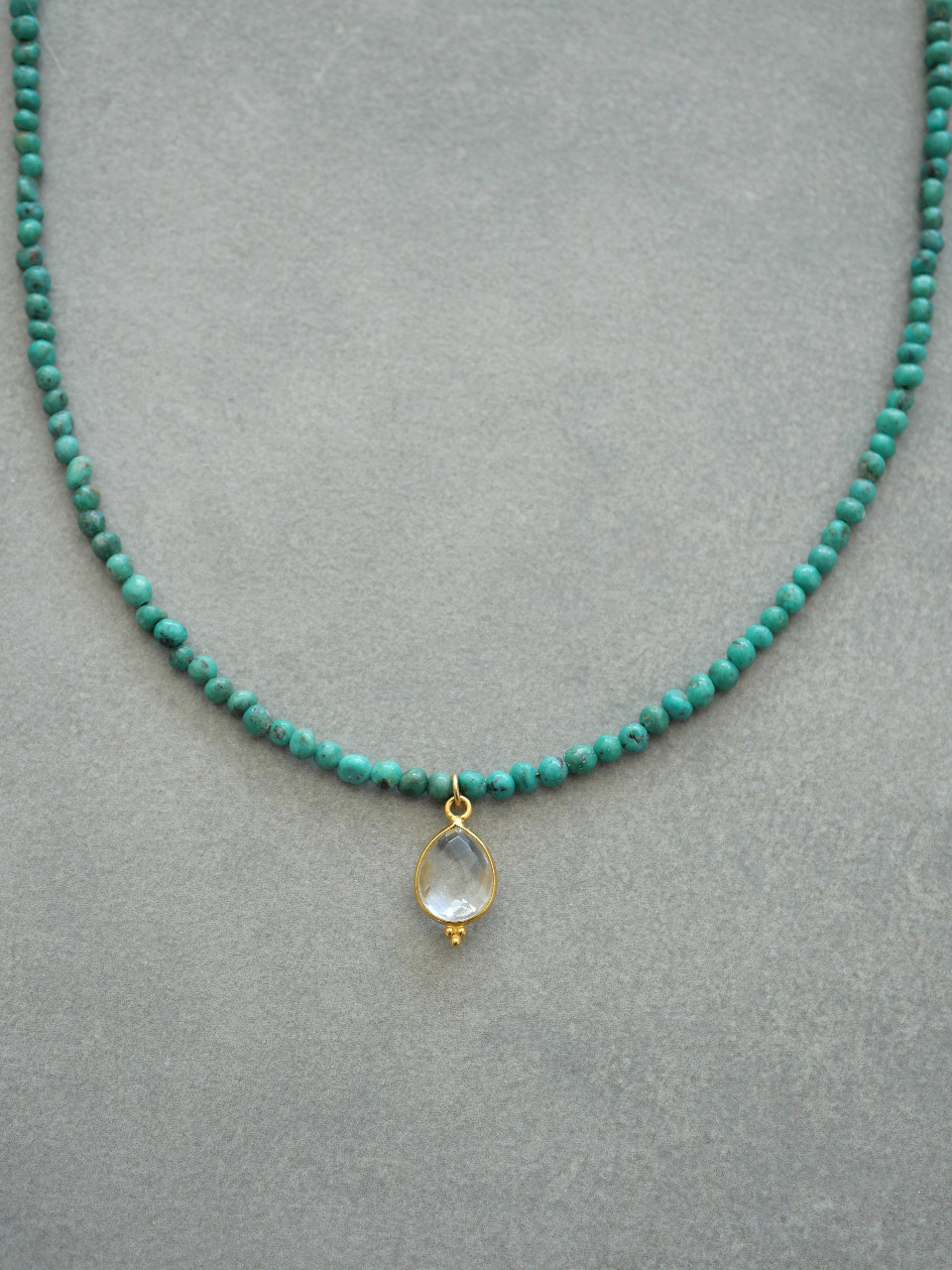 Collier composé de turquoise naturelle, et d’un pendentif en cristal plaqué or.