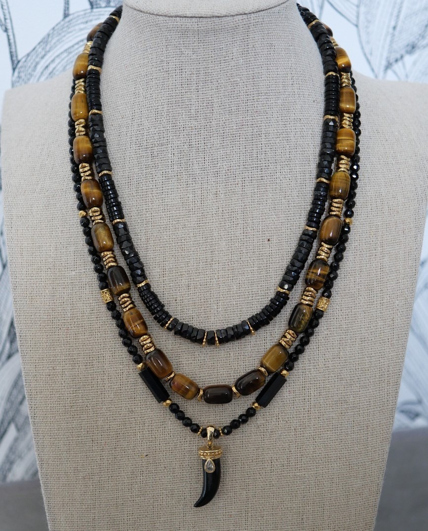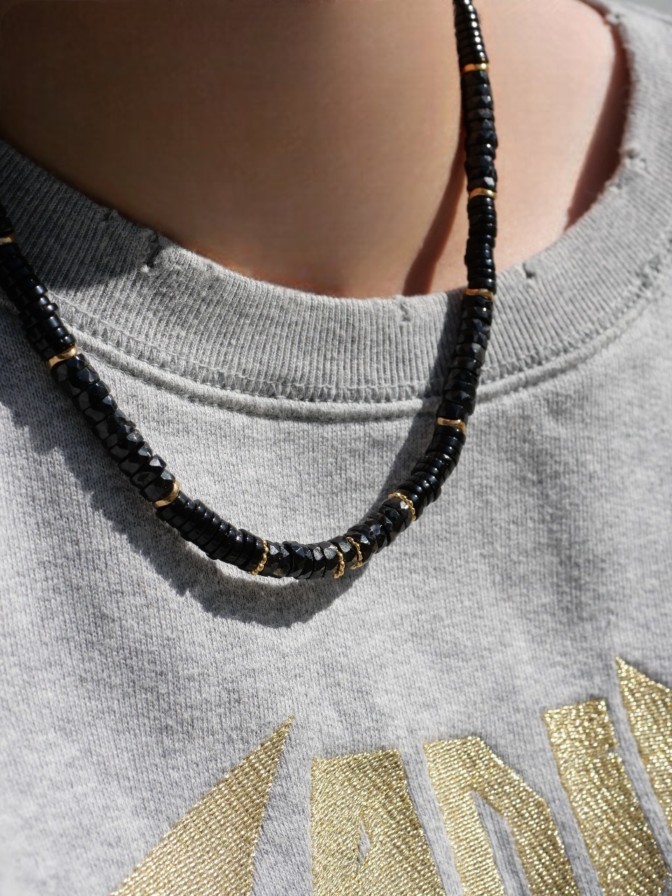 Le collier Evy est composé de spinel, d’onyx et de perles plaquées or. Le collier noir, décontracté ou habillé, il fait partie intégrante de nos accessoires fétiches.