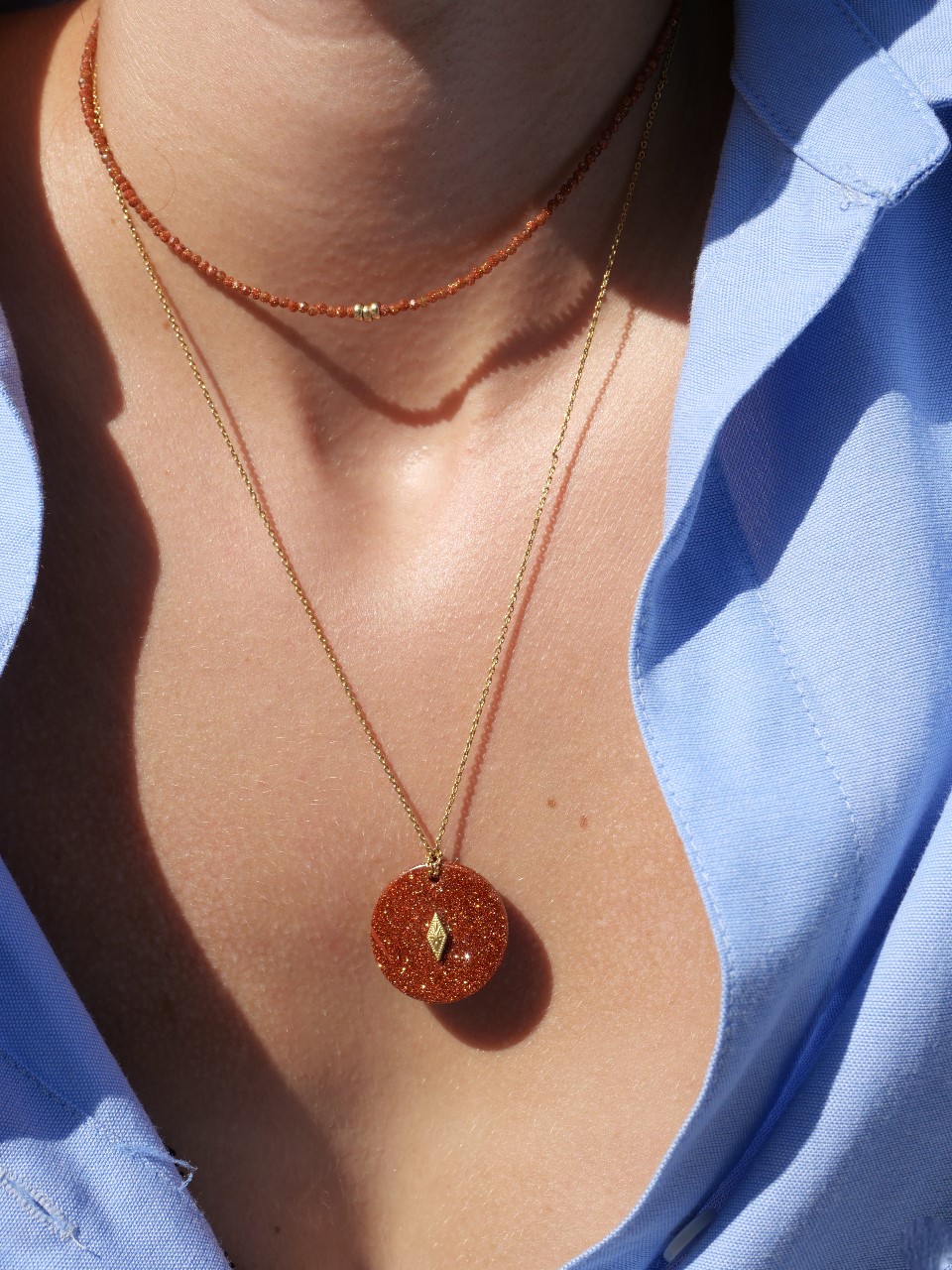 - Fermoir, chaine rallonge et logo plaqués or 3 microns.