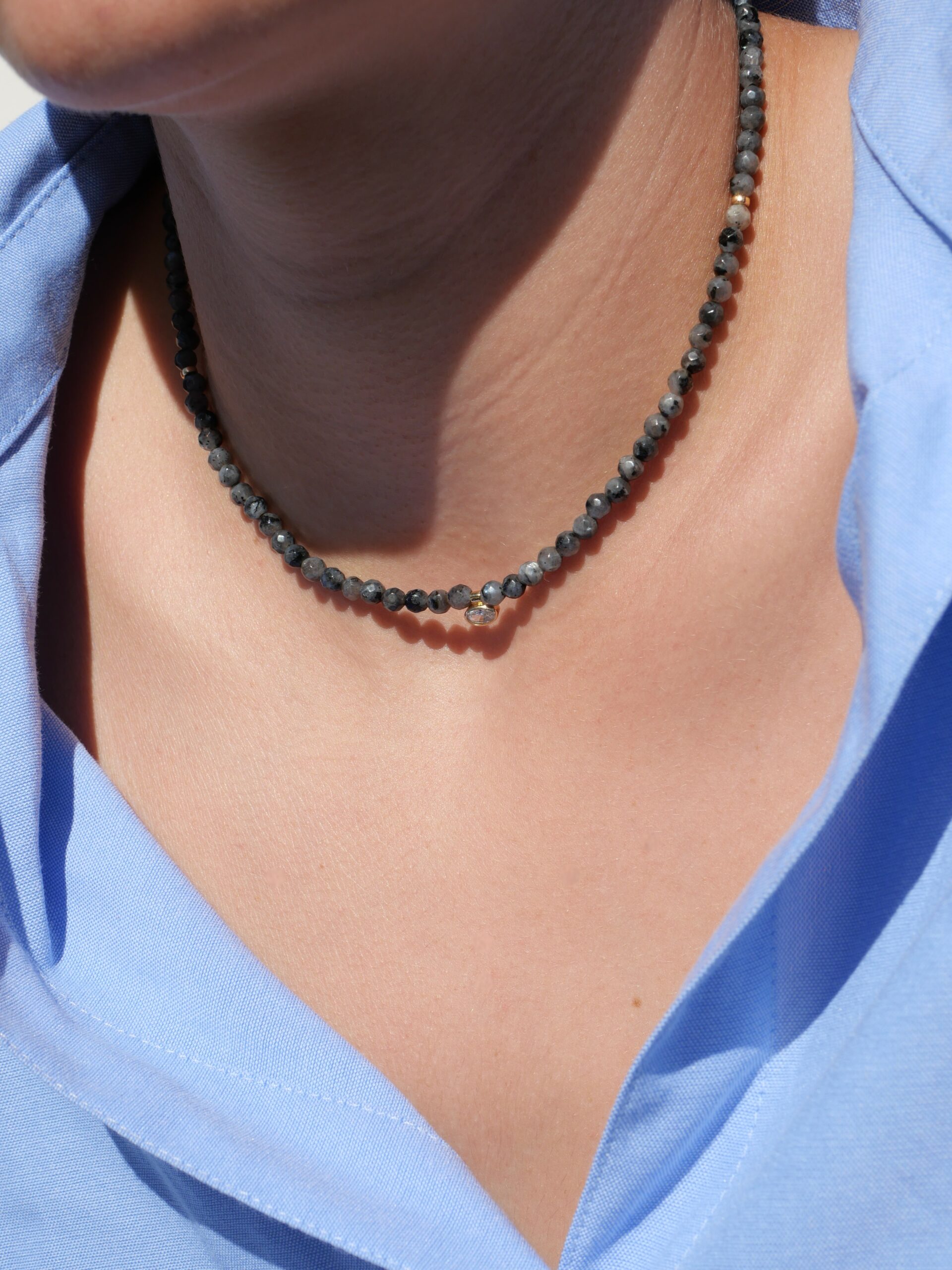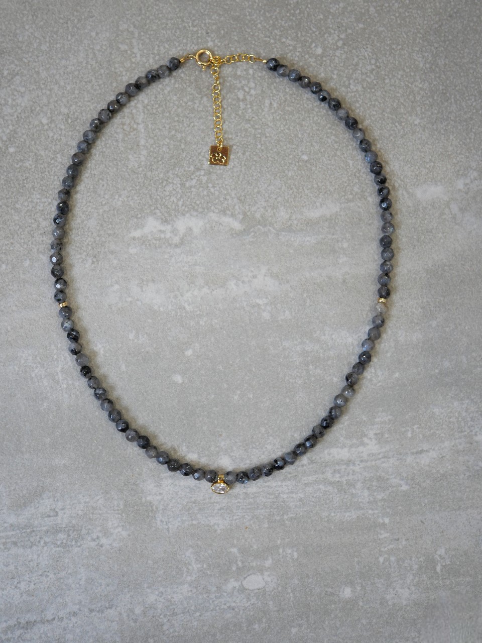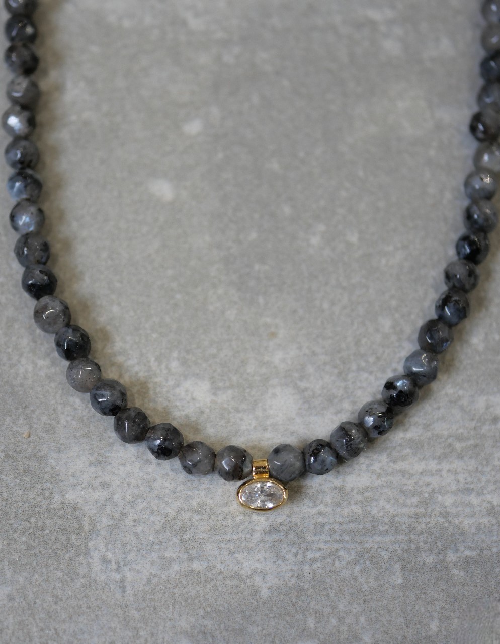 Collier composé de labradorite dark facettée, d’un pendentif en cristal et de perles, plaqués or 3 microns.