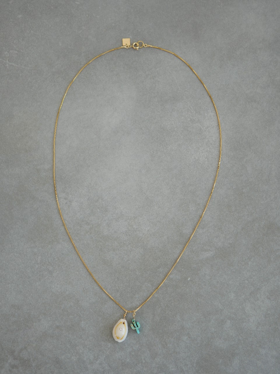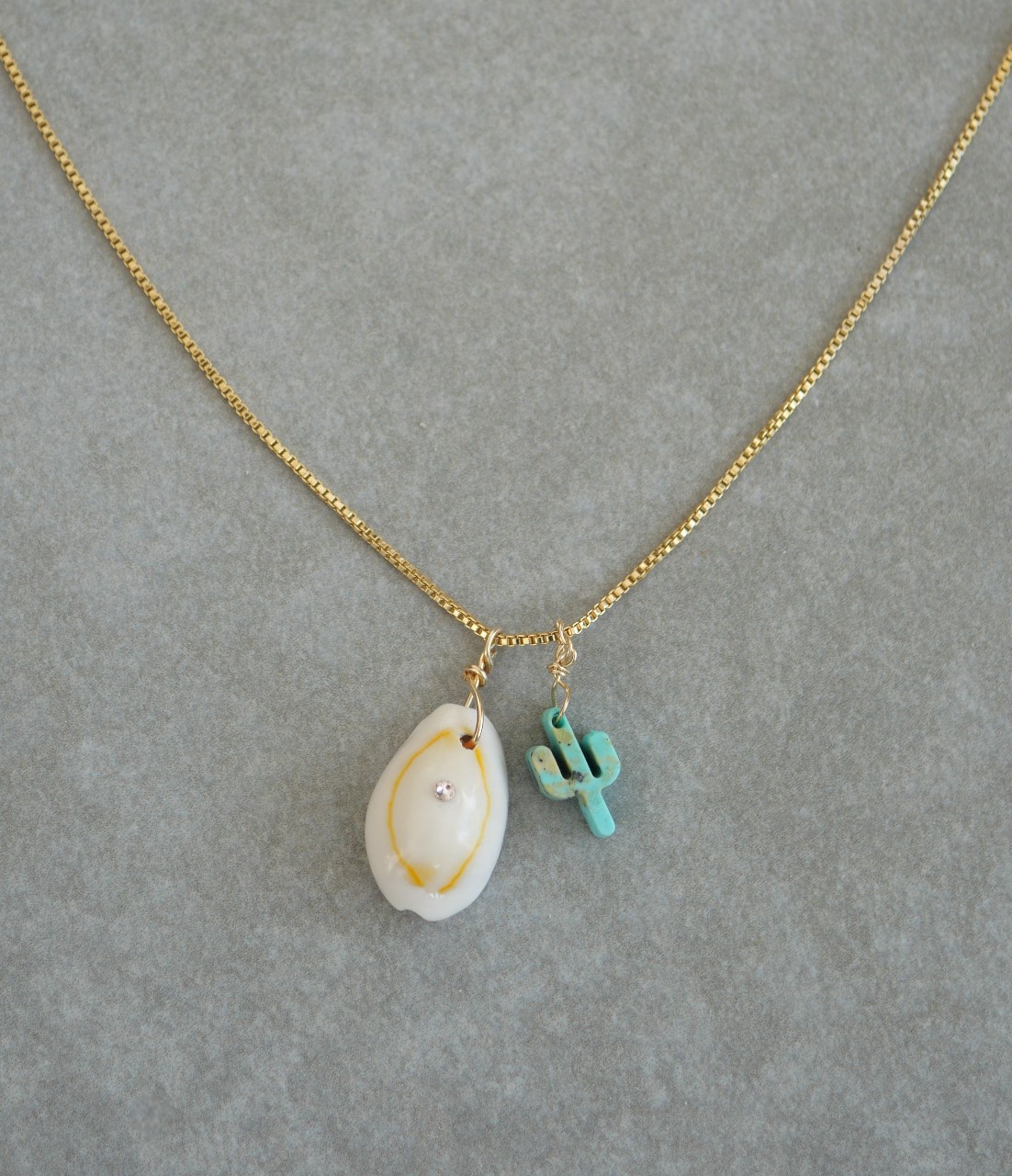 Collier long composé d’une chaine fine, maille vénitienne en Gold filled, et d’un pendentif composé d’un coquillage cauri strassé et d’un cactus en turquoise naturelle.