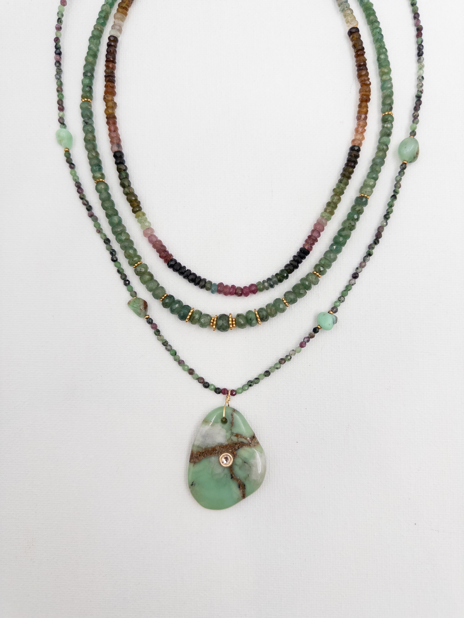 Collier ras de cou composé de tourmaline multicolore facettées et d’un pendentif en jaspe.